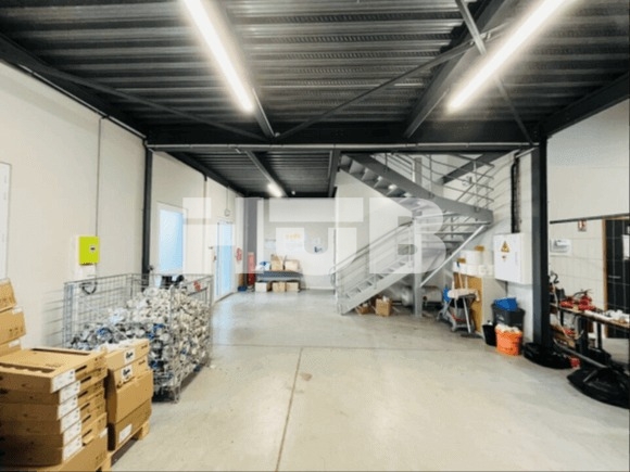 Des bureaux d’accompagnement sont aménagés en plateau mezzanine au R+1 sur une surface d’environ 79 m², avec une vue directe sur l’entrepôt, et disposent de deux sanitaires distincts femmes et hommes. Six places de stationnement privatives pour véhicules légers complètent ce bien, dont une place réservée aux personnes à mobilité réduite.